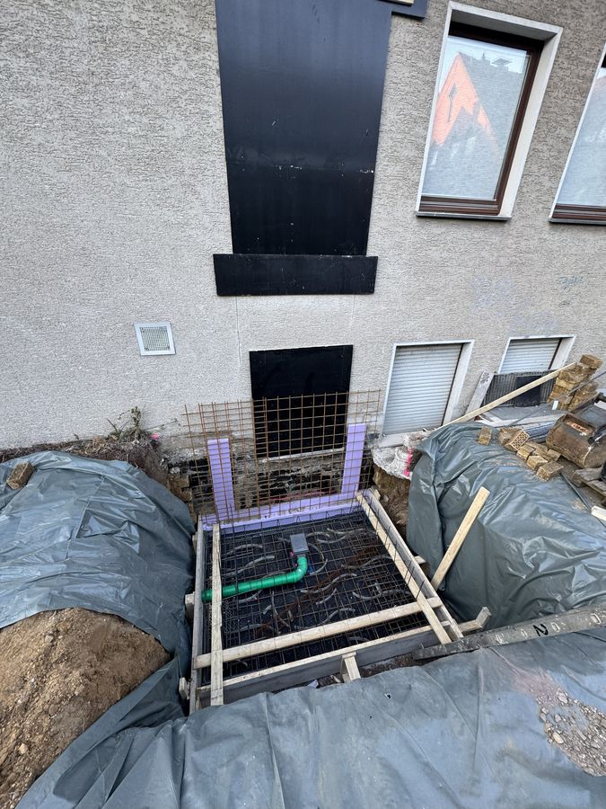 Die Baugrube ist bereits ausgehoben und die ersten Vorarbeiten zur Errichtung der Bodenplatte sind erfolgt.