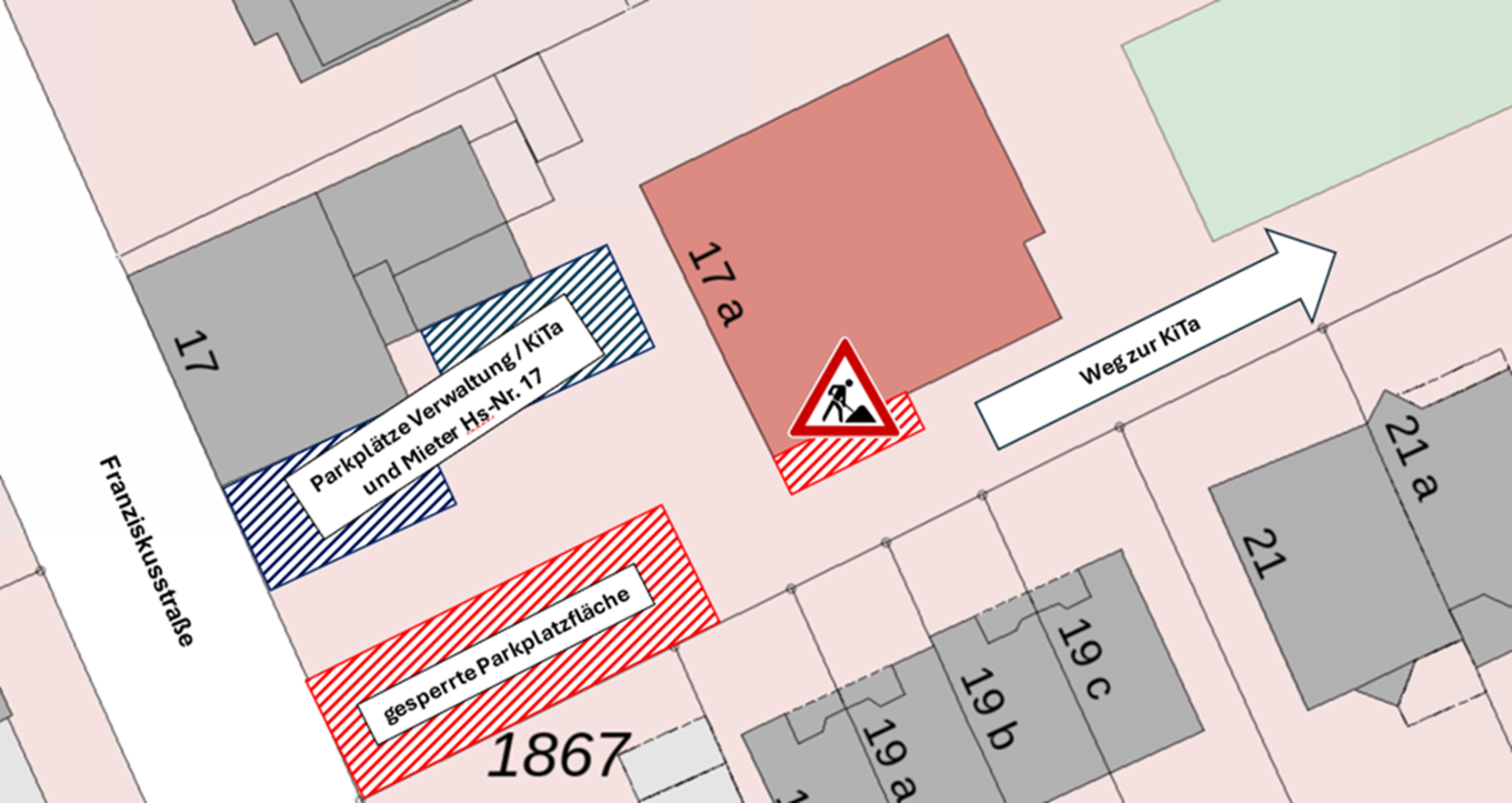 Die Nutzung der verbleibenden Parkplätze ist lediglich den Beschäftigten der Pfarrei, der KiTa und den Mietern des Hauses Franziskusstr. 17 vorbehalten.